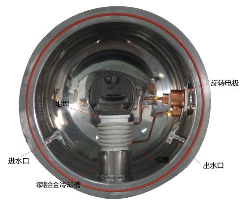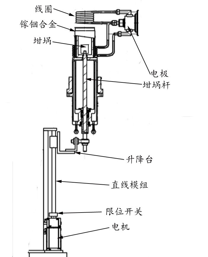 感应线圈上放石墨桶,石墨桶被感应发热,定向凝固杆上安装坩埚,石墨桶和冷却液之间有个温度梯场。坩埚被加热后物料熔化,定向凝固杆慢慢下降,物料在这个温度梯场中晶格按照一定的顺序排列,形成有序的晶体。