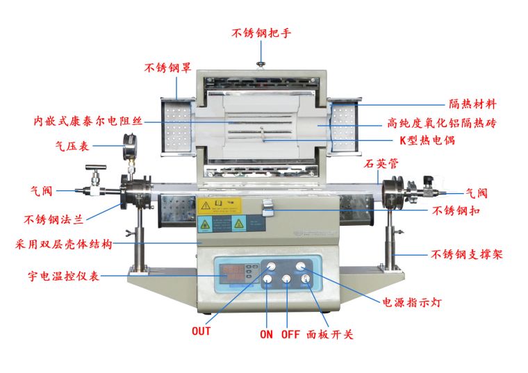 2.由于气瓶内部气压较高,所以向炉管内通入气体时,气瓶上必须安装减压阀,为了确保安全,建议使用压力低于0.02MPa