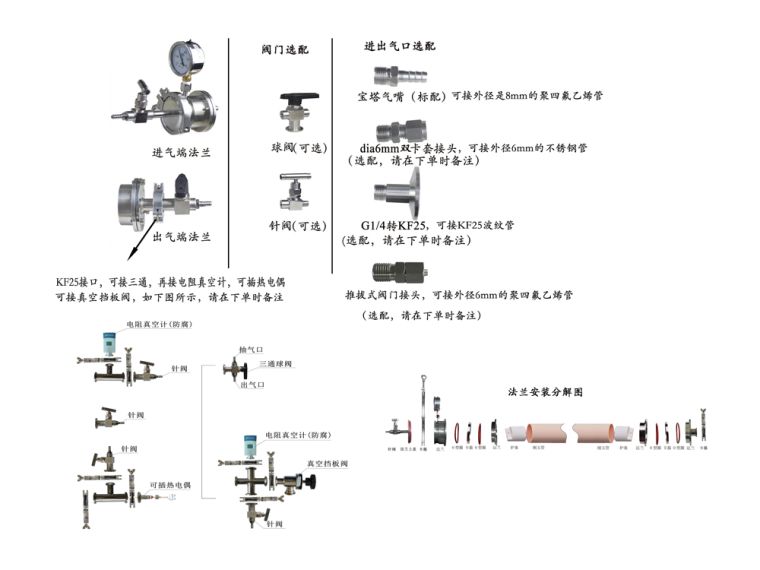 铰链式法兰(选购) 可以接电阻真空计和KF25波纹管的法兰(选购) 水冷法兰(选购)