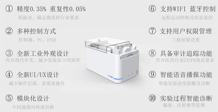 流量平稳,精度高,实现稳定的微量液体传输,支持微流控和高压静电纺丝应用