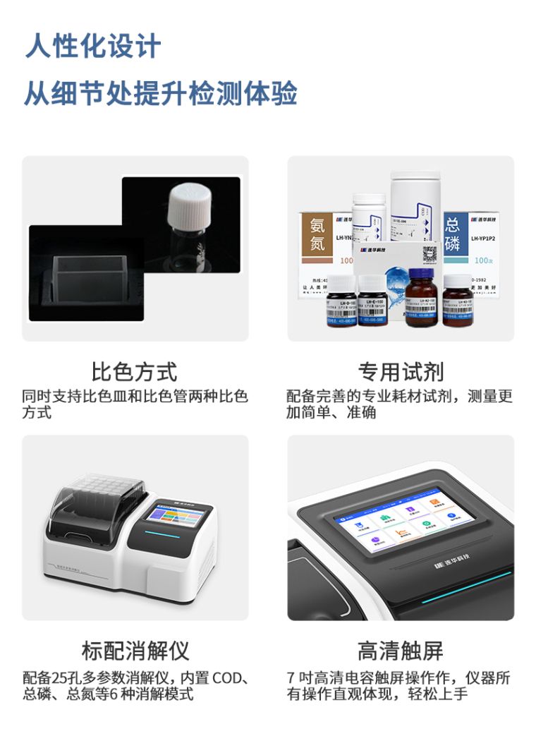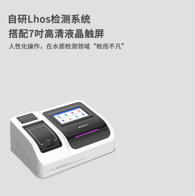 1、自主研发的Lhos连华水质检测系统搭配7吋高清液晶触屏,全中文操作界面,人性化操作设计,在水质检测领域“检而不凡”;