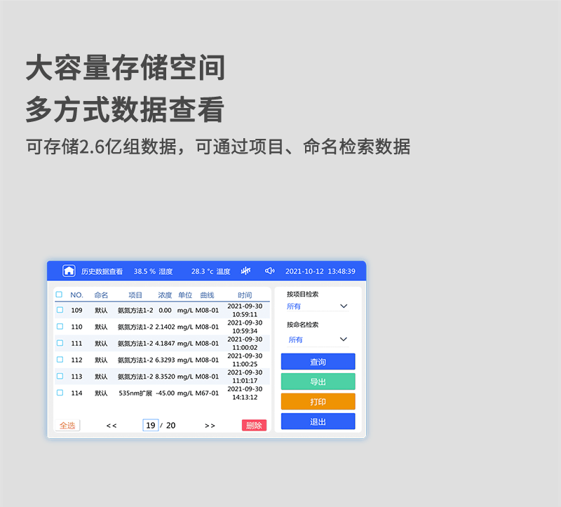 5、仪器可**存储约2.6亿组(5G)数据,为方便大量数据查找,可通过项目、命名、时间检索,并随意选择分析;