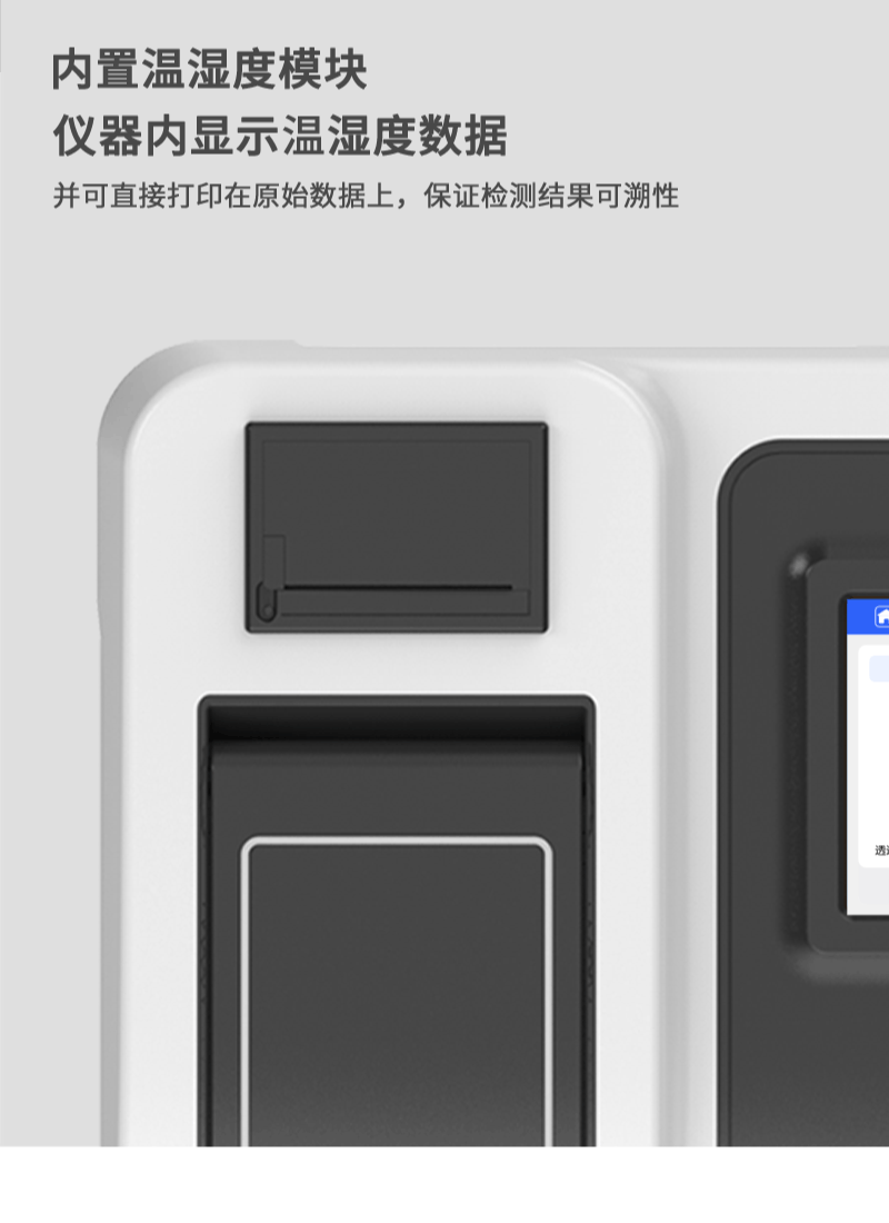 10、内置温湿度检测模块,直接仪器内显示温湿度数据,并可直接打印在原始数据上,保证检测结果的可溯性;