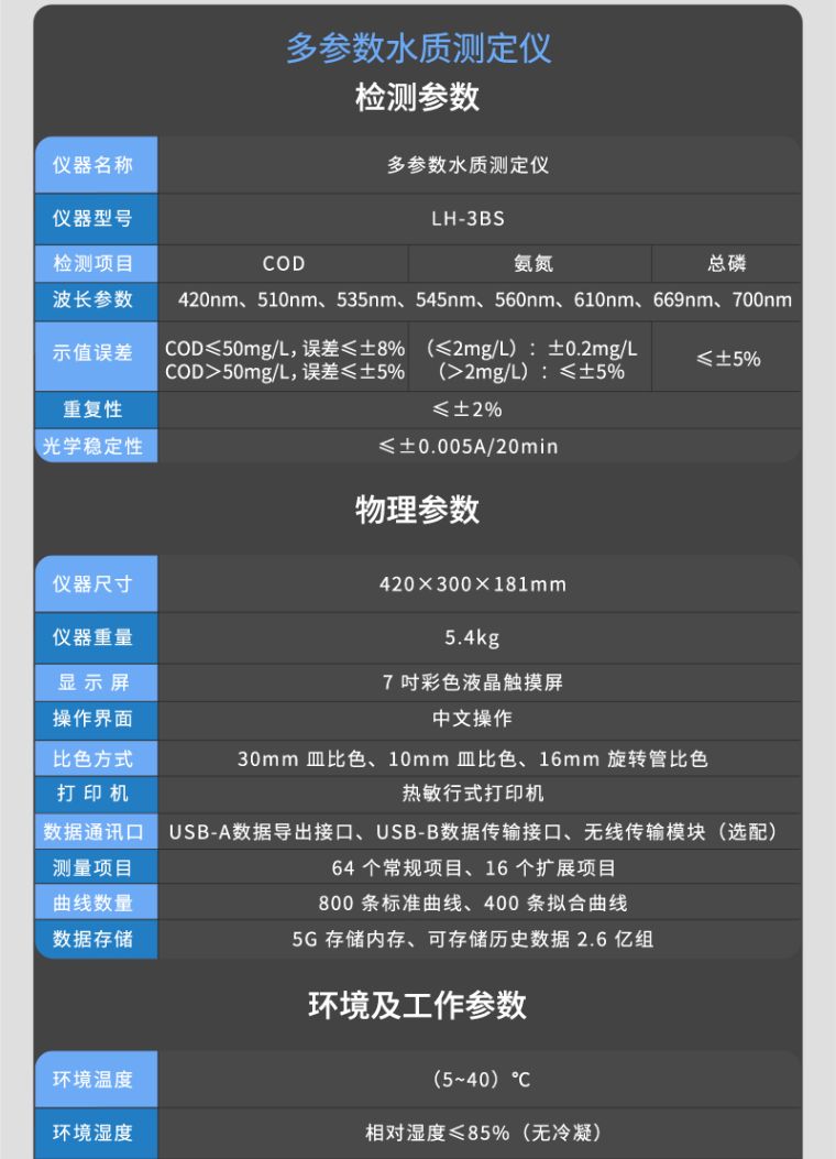 示值误差:COD(≤50mg/L):≤±8%;COD(>50mg/L):≤±5%;