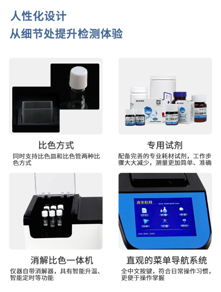 4、具有多光路无干涉系统,可测定COD、氨氮、总磷和浊度。同时支持皿比色和管比色两种比色方式;