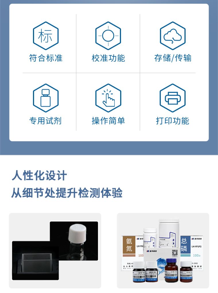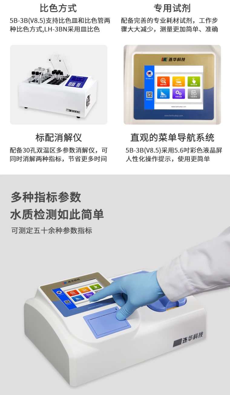 1、五十余项参数指标:直接测定化学需氧量(COD)、氨氮、总磷、总氮、悬浮物、色度(铂钴色系)、浊度、重金属、有机污染物和无机污染物等多项指标,浓度直读;