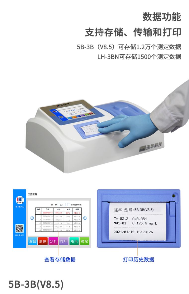 4、数据存储:5B-3B(V8.5)可存储1.2万个测定数据,LH-3BN可存储1500个测定数据(每条数据信息包含检测日期、检测时间、检测时仪器参数、检测结果);