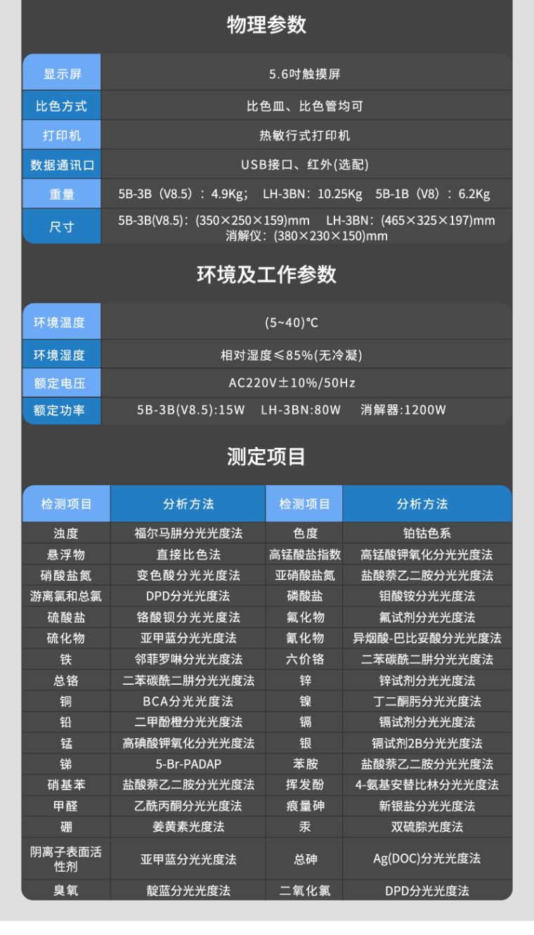 | 重 量 | 主机:5B-3B(V8.5):4.9Kg;LH-3BN:10.25Kg 消解仪:5B-1B(V8):6.2Kg | 尺寸 | 5B-3B(V8.5):(350×250×159)mmLH-3BN:(465×325×197)mm消解仪:(380×230×150mm | |