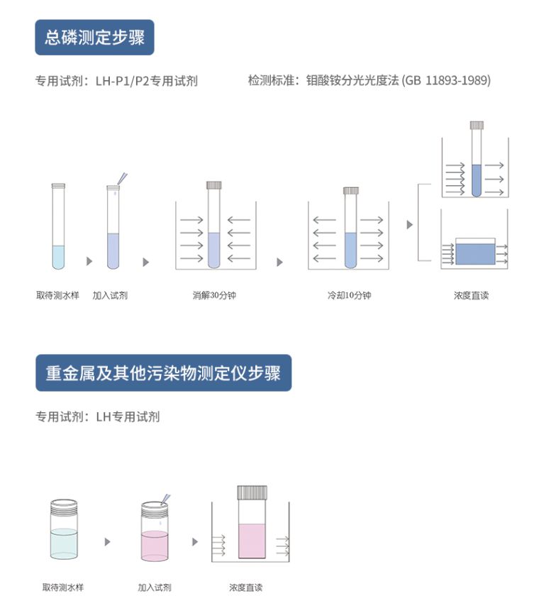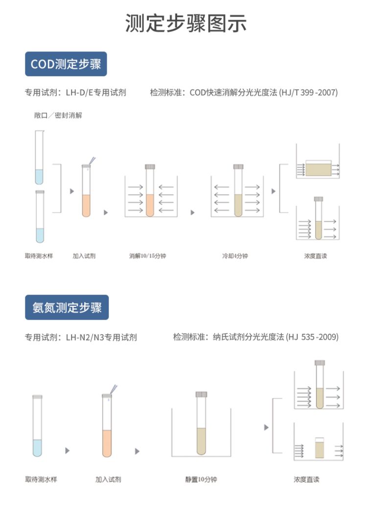 | 测定范围 | (2~15000)mg/L(分段)(预制试剂到15000,其他到10000) | (0~160)mg/L(分段) | (0~100)mg/L(分段) | (0~100)mg/L(分段) |