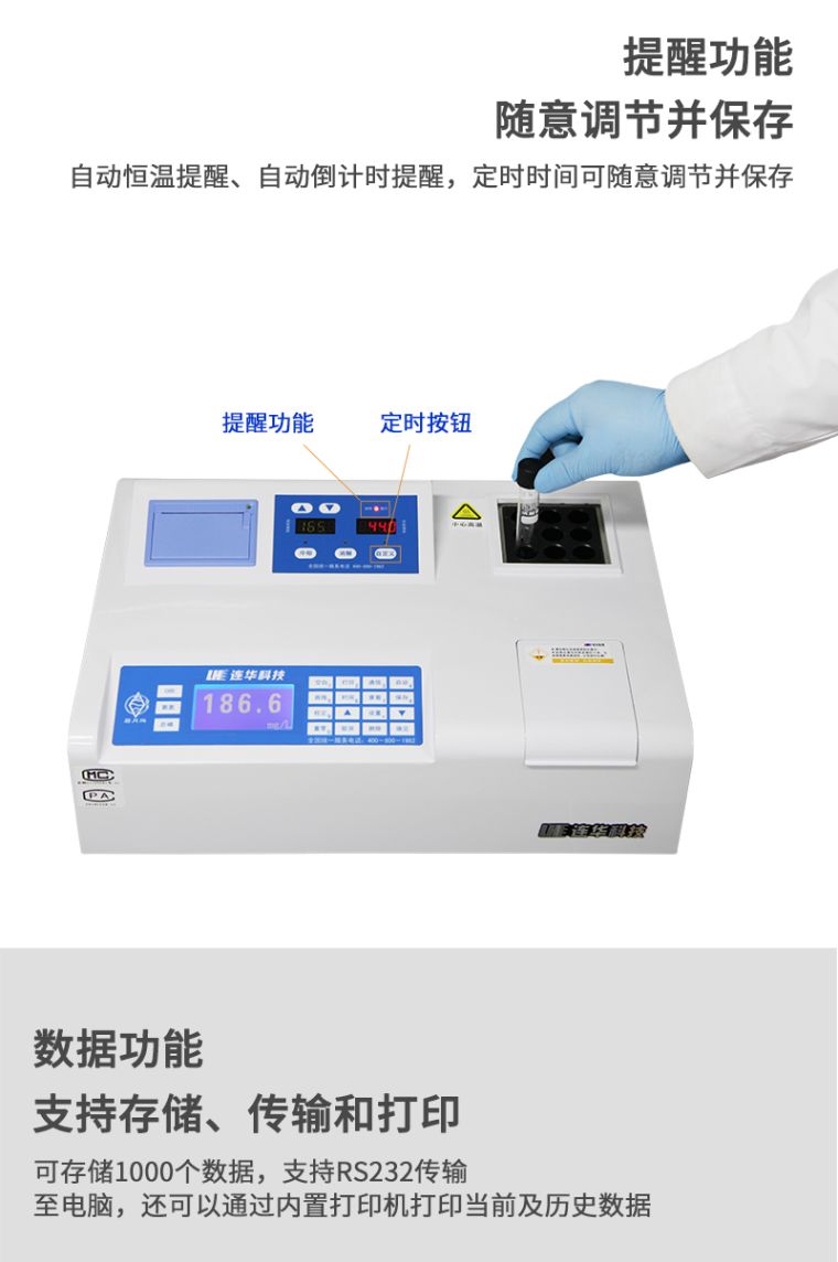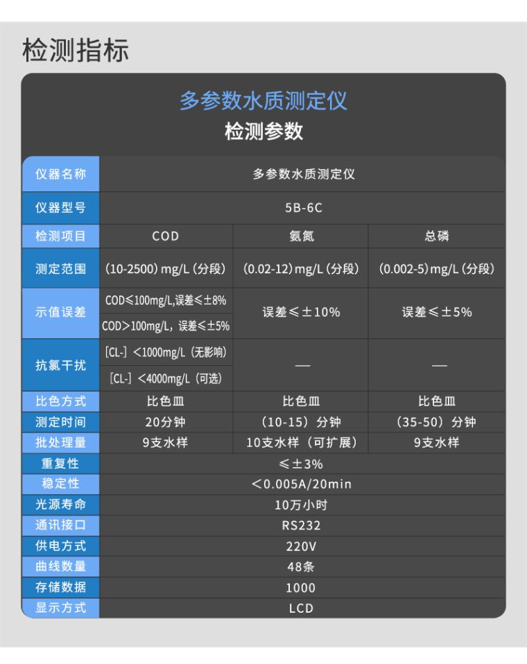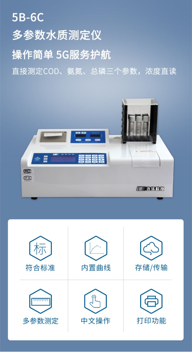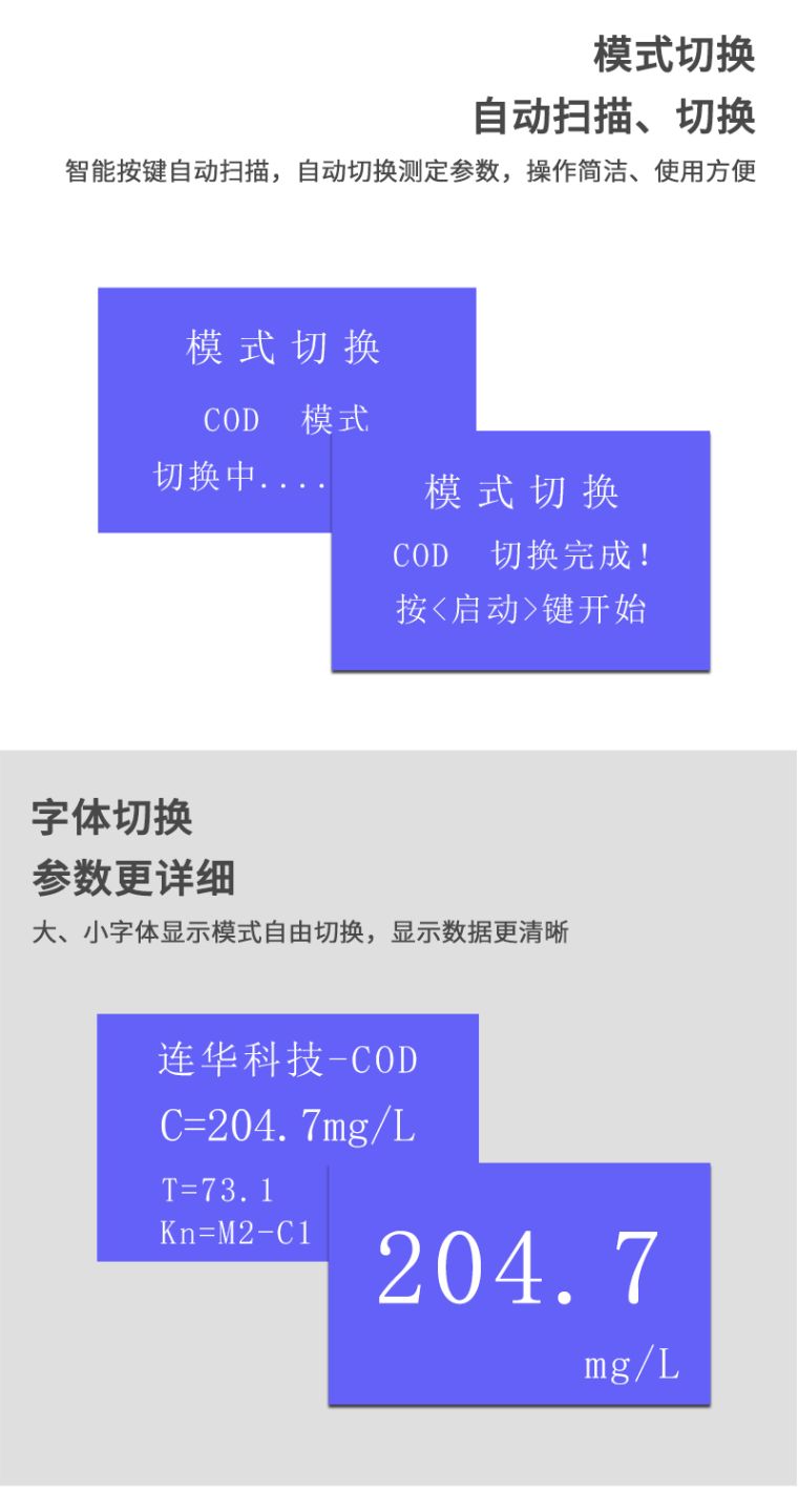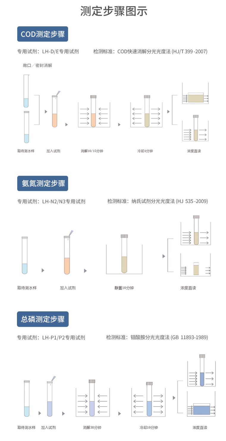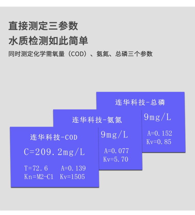 2、同时测定化学需氧量(COD)、氨氮、总磷三个参数,浓度直读;