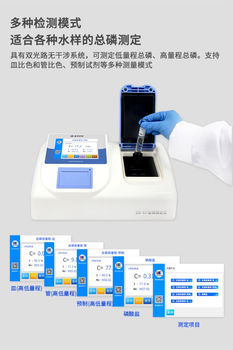 1、多种测定模式:具有双光路无干涉系统,可测定低量程总磷、高量程总磷。支持皿比色和管比色、预制试剂等多种测量模式;