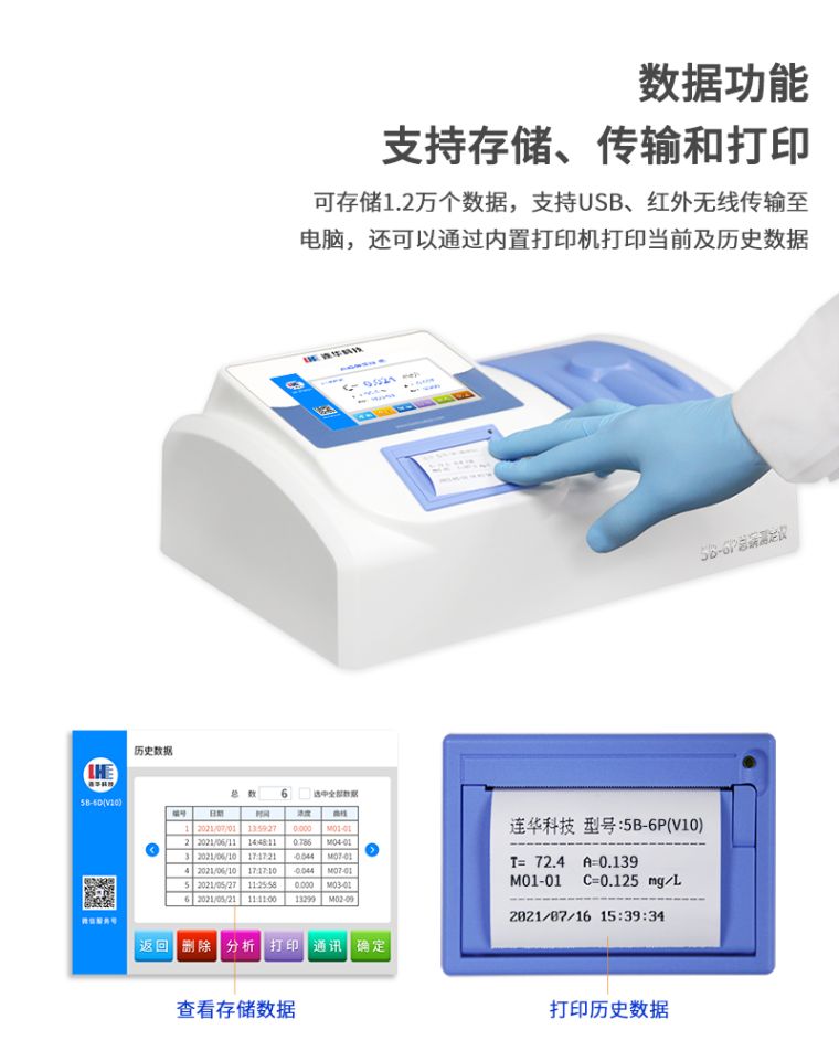 7、数据功能:可存储1.2万个数据,支持USB、红外传输至电脑,还可以通过内置打印机打印当前及历史数据;