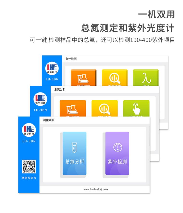 2、一机双用:内置总氮测定和紫外光度计两种测量模式,不仅可以一键检测样品中的总氮,还可以检测190-400nm紫外项目;