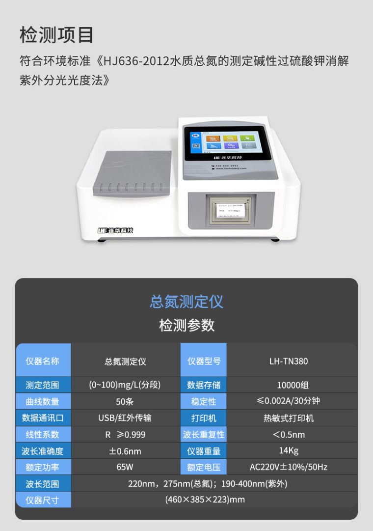 1、符合标准:符合环境标准《HJ636-2012水质总氮的测定碱性过硫酸钾消解紫外分光光度法》;