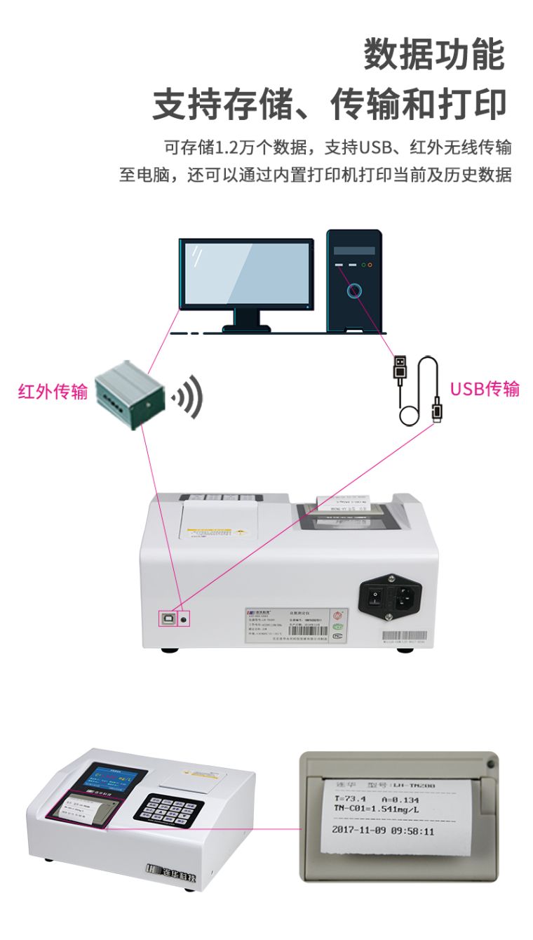 5、向计算机传输当前数据和所有存储的历史数据,支持USB传输和红外无线传输(可选);