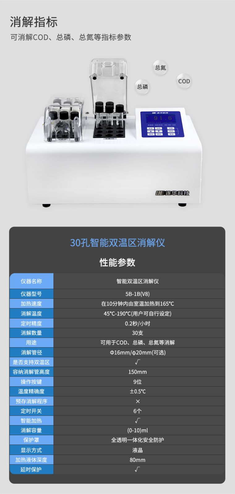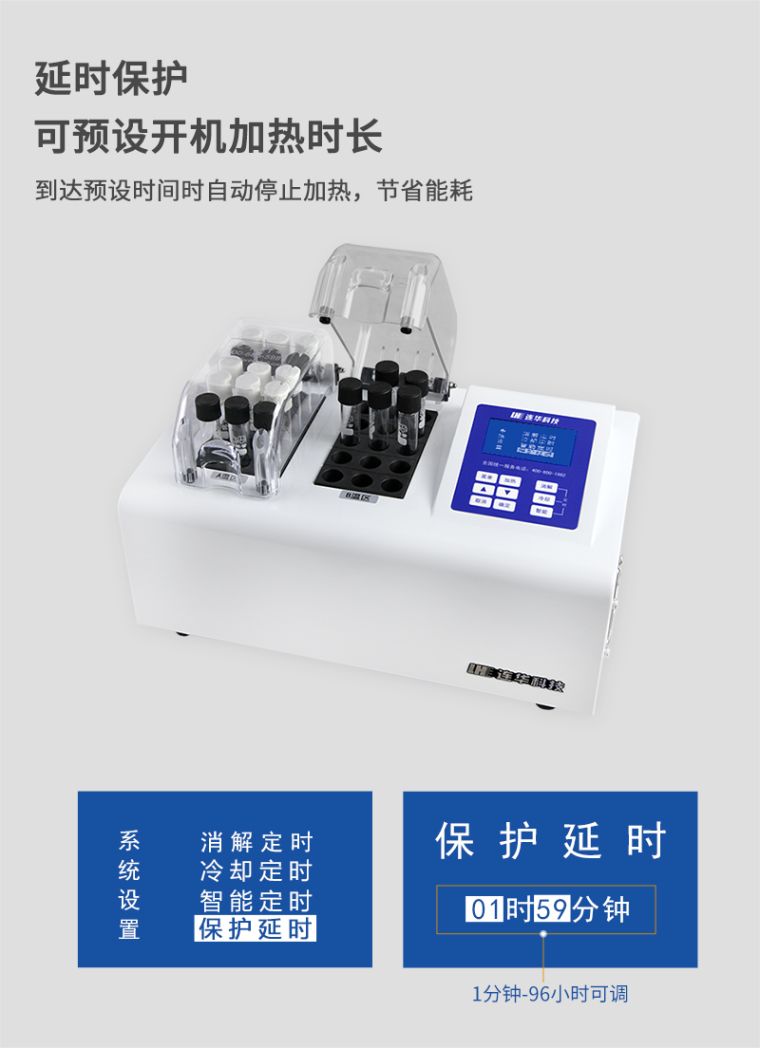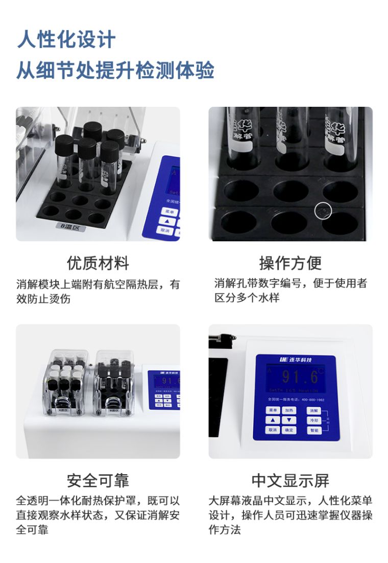 1.安全可靠:全透明一体化耐热保护罩,既可以直接观察水样状态,又保证消解安全可靠;