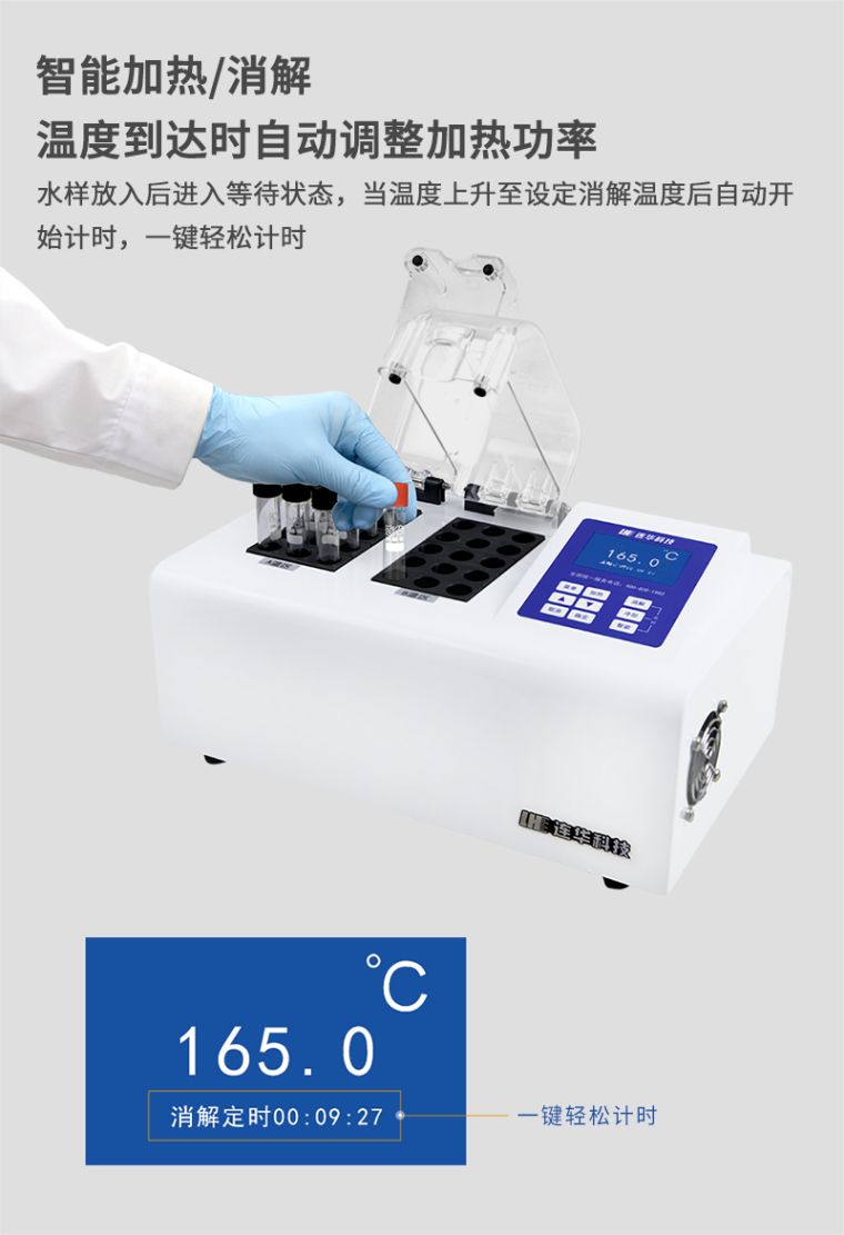 7.智能消解:水样放入后进入等待状态,当温度上升至设定消解温度后自动开始计时,使用户一键轻松计时;