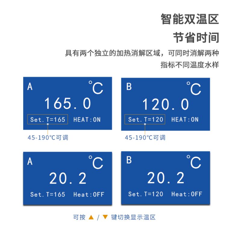 9.双温区加热系统:可同时消解两种指标不同温度水样,节省时间。