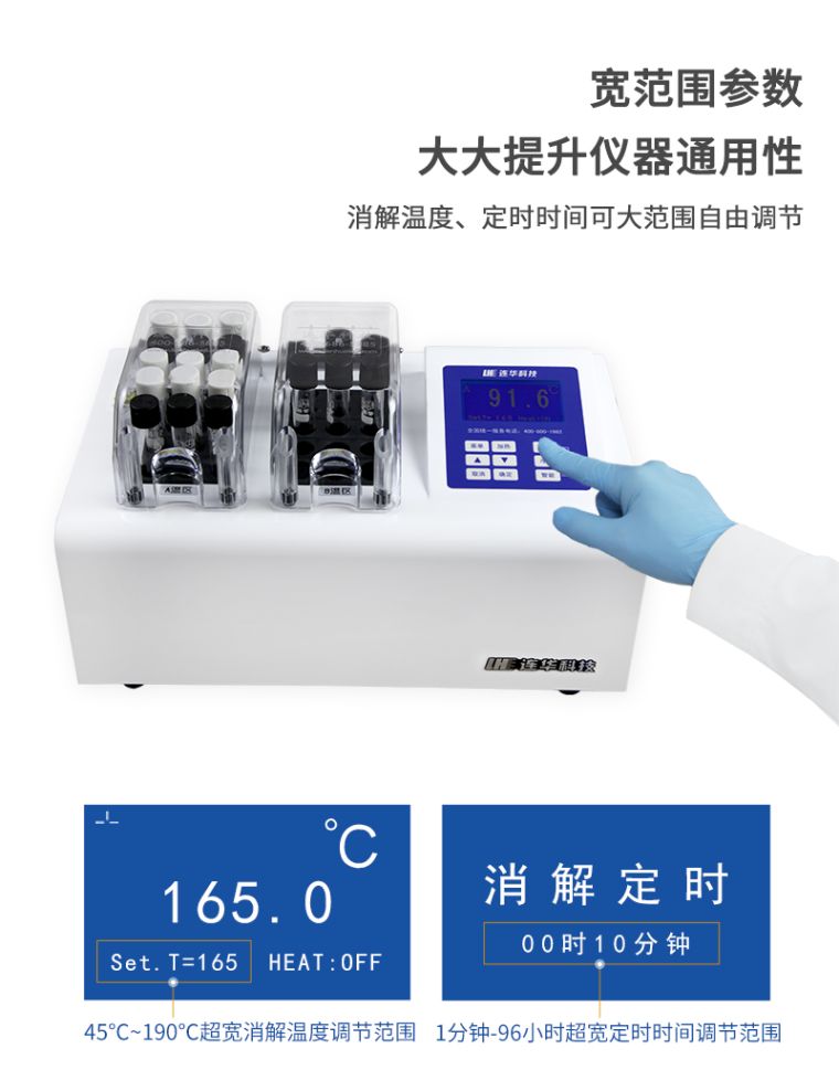4.宽范围参数:消解温度、定时时间可大范围自由调节,提高仪器通用性;