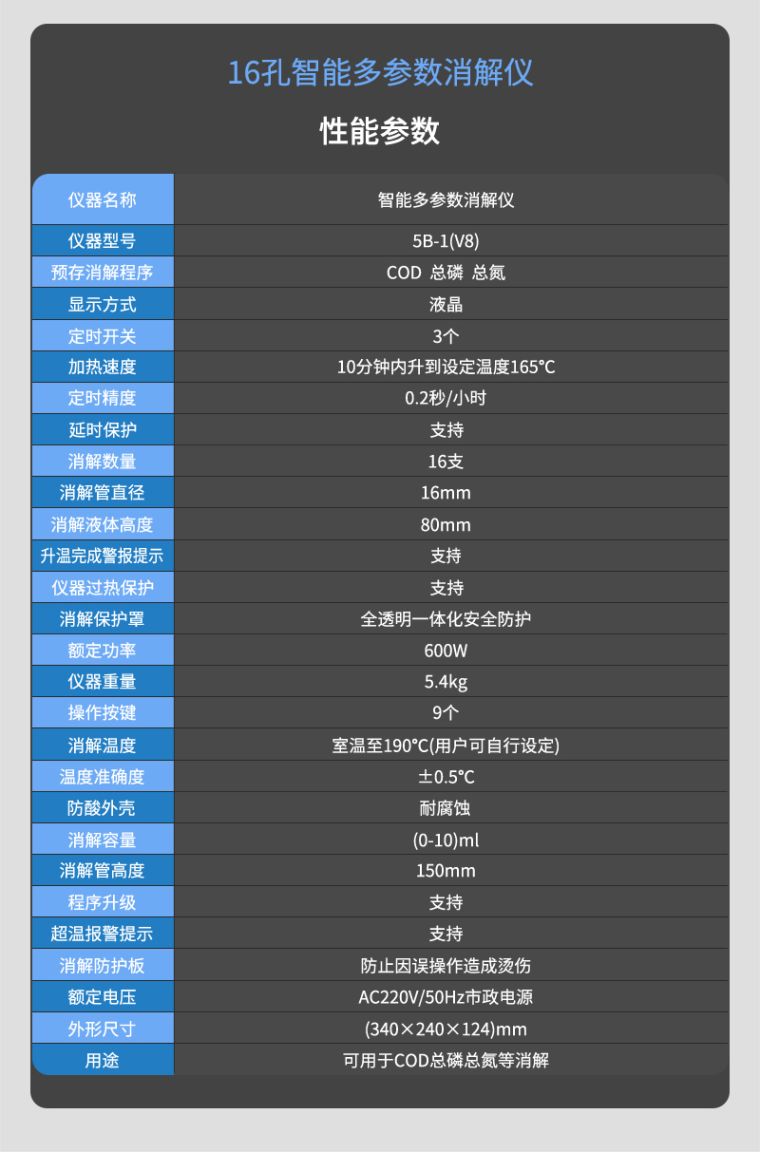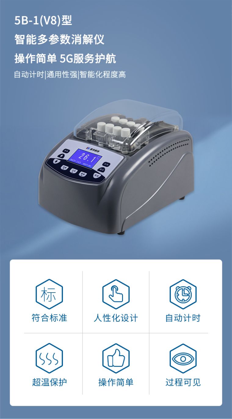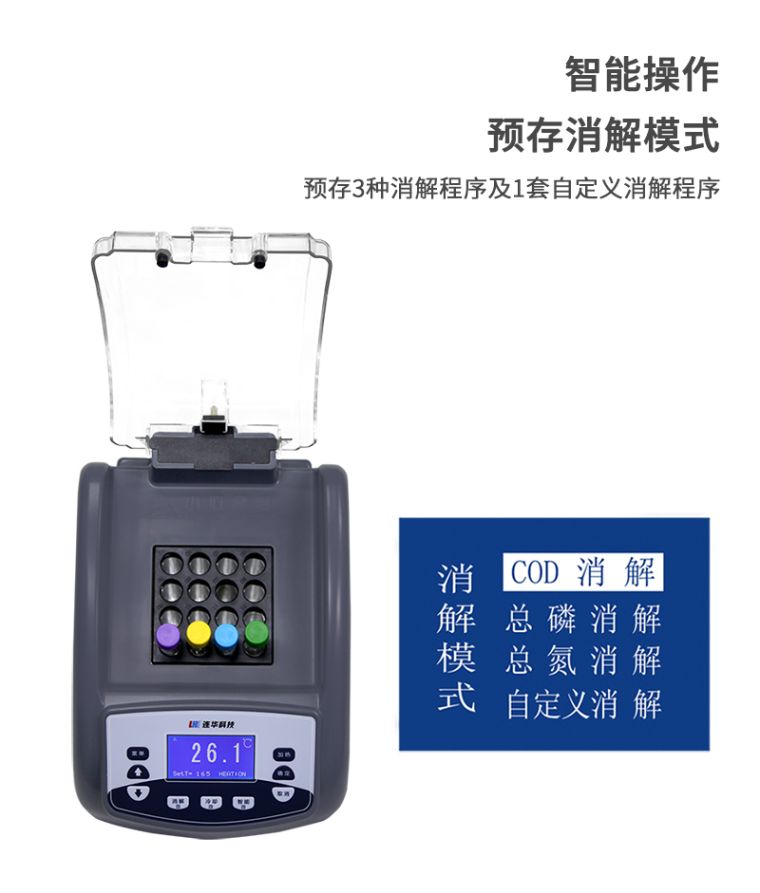 1.安全可靠:全透明一体化耐热保护罩,既可以直接观察水样状态,又保证消解安全可靠;
