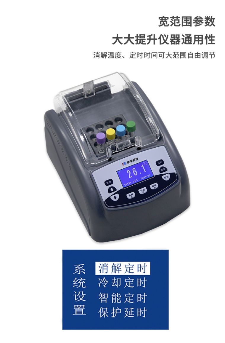 4.宽范围参数:消解温度、定时时间可大范围自由调节,提高仪器通用性;