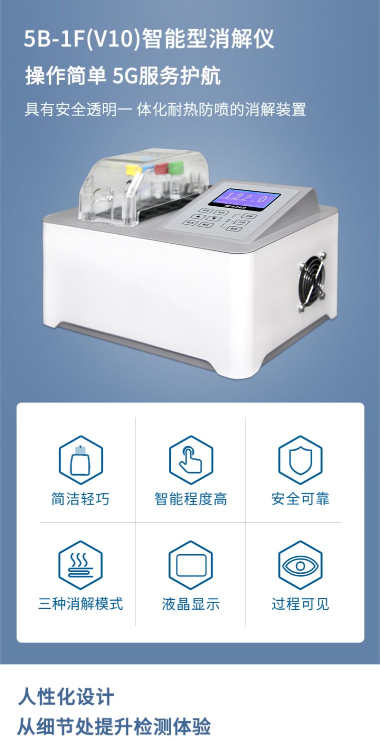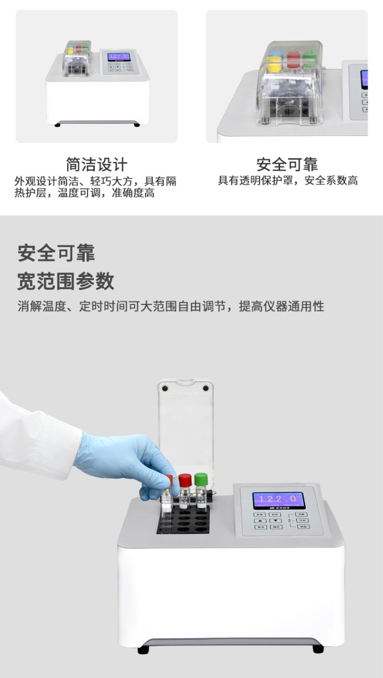 1、安全可靠:全透明一体化耐热保护罩,既可以直接观察水样状态,又保证消解安全可靠;