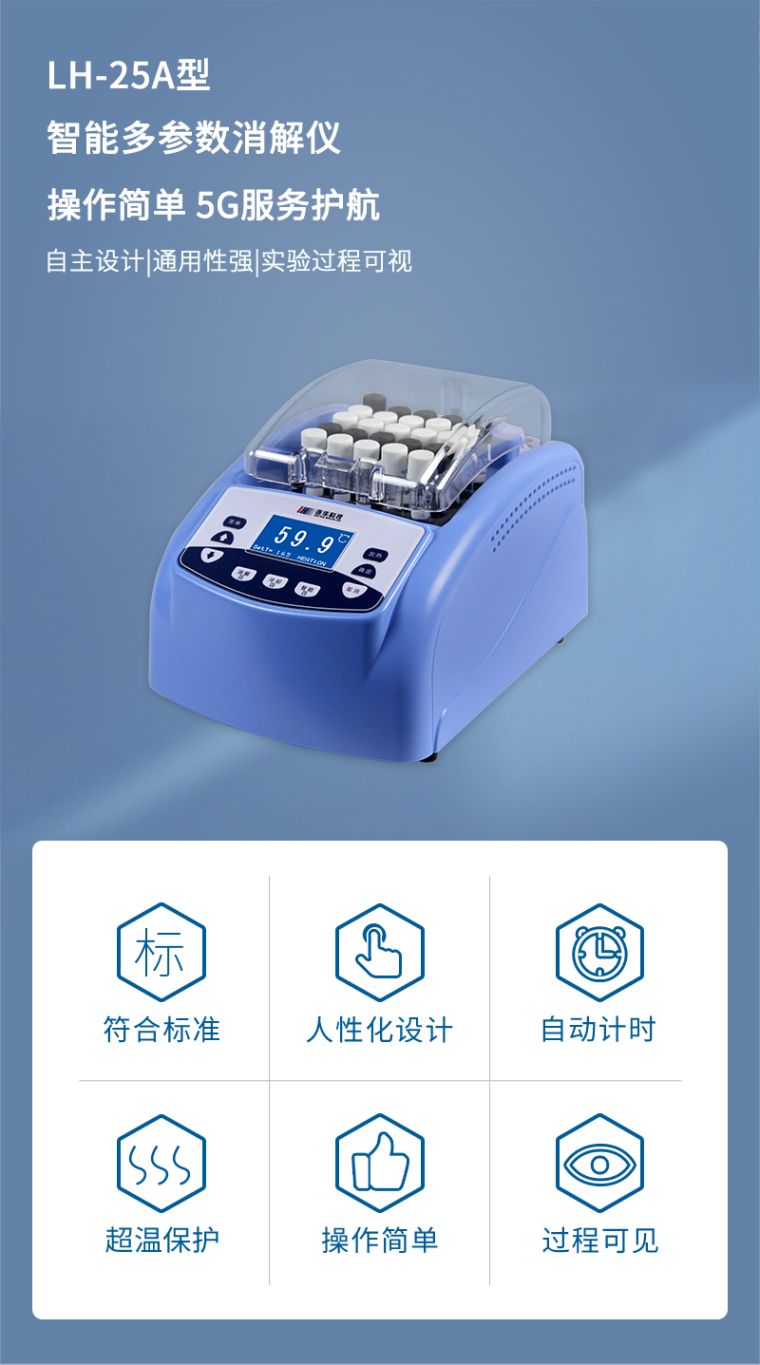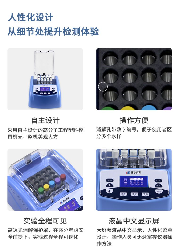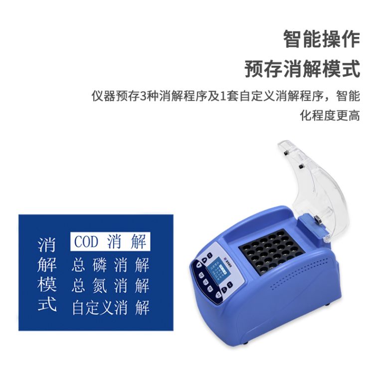 3.仪器预存3种消解程序(COD、总磷、总氮)及1套自定义消解程序,智能化程度更高;