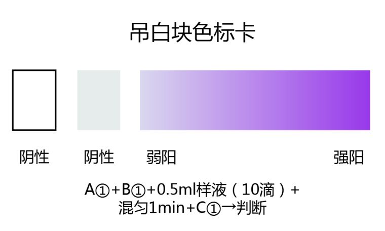 2.2:若反应结果溶液呈明显的紫色,表示被检样品浸泡过吊白块,其颜色越深表示吊白块含量越高。(详见色卡)