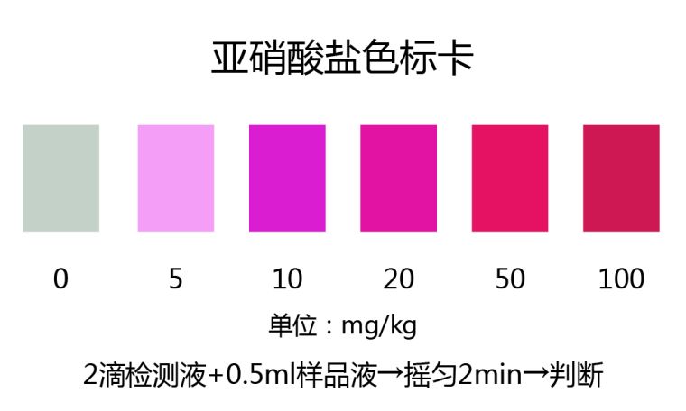2.1:2分钟后观察检测管中颜色的深浅,紫红色颜色越深,表示样品中亚硝酸盐的含量越高。