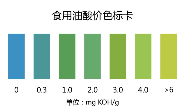 1.1:取一条酸价检测试纸浸入油样中半秒钟取出,5min后立即与标准色卡比较,找出与对照色卡上相近的色阶即为食用油酸价的大致含量;