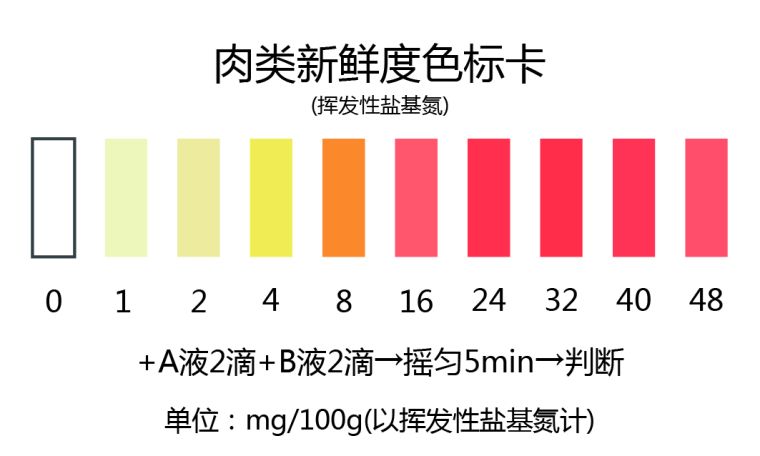 1.2:吸取5ml样品液于比色瓶中,滴入2滴检测试剂A,再滴入2滴检测试剂B, 振摇混匀。显色5分钟,观察颜色变化并与标准比色卡比对,找出与对照色卡上相近的色阶即为每100g肉品中挥发性盐基氮的大致含量。
