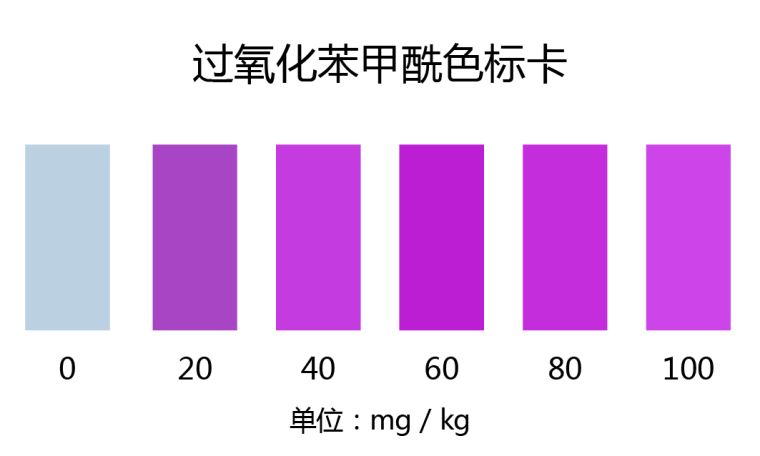 1.3:显色10min后立即与比色卡对照,找出相应的含量。如颜色有变红则说明可能掺有过氧化苯甲酰,颜色越深,含量越高。