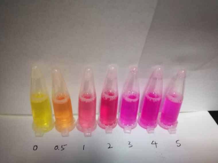 2.2:若反应结果溶液呈明显的深黄色和淡粉红色,表示被检样品中含有重金属镉,其颜色越深表示重金属镉的含量越高。(详见色卡)
