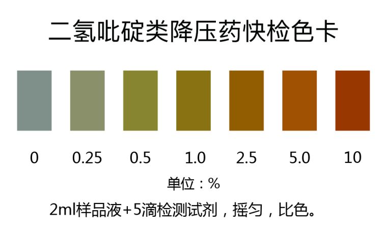 取上述滤液2ml于试管中,加入5滴检测液,振荡混匀,对照色卡比色,二氢吡啶类降压药含量越高,颜色越深;