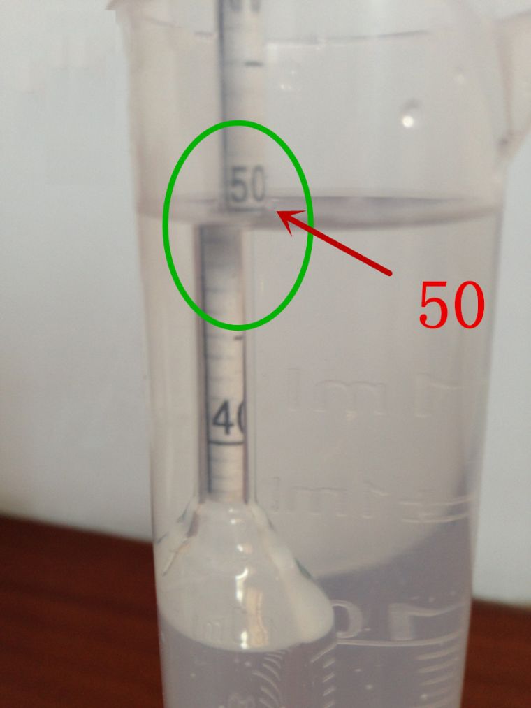 1.3:读数按弯月面下缘读数,观察者的眼睛应稍低于液面,使看到的液面成椭圆形,然后慢慢抬高眼睛位置直至椭圆形变成一条直线为止,读出此直线的分度表上的位置(下右图为50);