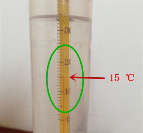 1.4:将温度计放入量筒里不要贴筒壁,稍等片刻,目光平视看准读数(下左图为15℃);