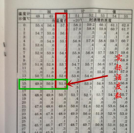 1.5:找到换算表,找到纵向酒度计读数和横向温度计读数对应的交叉值即为白酒实际酒精度(上右图);