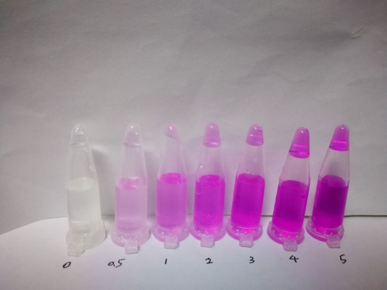 1.2:各取样品液和纯水1ml于离心管中,依次加入0.5 ml检测试剂A,3滴试剂B,摇匀。