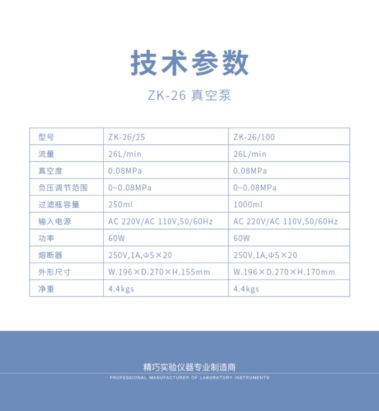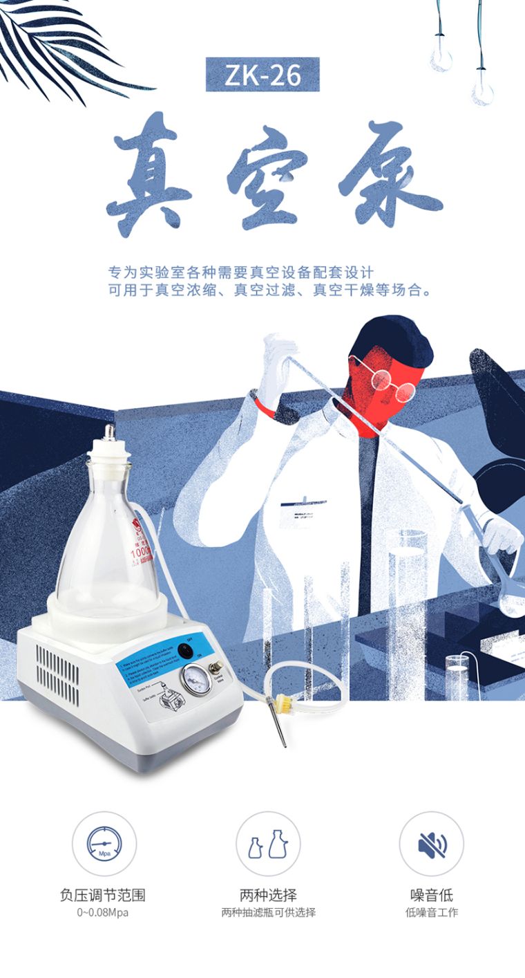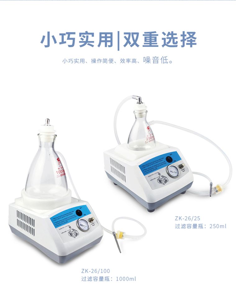 ZK-26真空泵是提高过滤效率、加强脱气效果的重要过滤配套设备。为保障过滤介质不被污染,一般均使用无油隔膜式真空泵,此类泵型是通过橡胶膜片的往返运动形成真空,其真空压力一般为0.08 Mpa左右(单级)。 ZK-26无油真空泵:专为实验室各种需要真空设备配套设计。可用于真空浓缩、真空过滤、真空干燥等场合。
