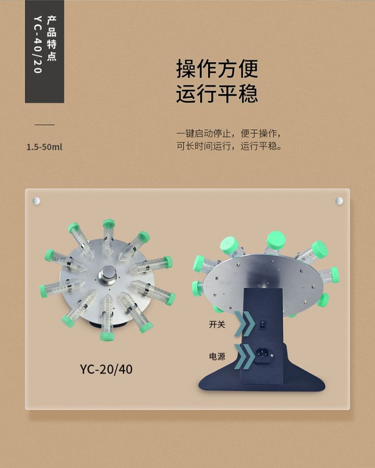 YC-40 旋转培养混合器用于样品的组织培养,萃取,测定沉降率(包括各种血样的化学测定),如:血样混合、放射免疫、葡萄糖、蛋白质、DNA、细胞、尿液、酶等湿化学分析,在生化、生物、细胞、免疫、化学、动植物分析、临床实验等诸多方面都有广泛应用。