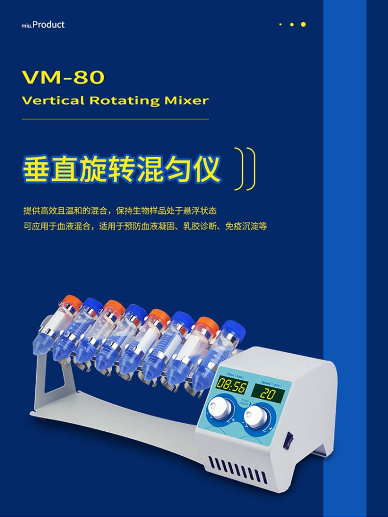 VM-80垂直旋转混匀仪提供高效且温和的混合,保持生物样品处于悬浮状态,如血液混合。适用于预防血液凝固、乳胶诊断、免疫沉淀等相似应用。