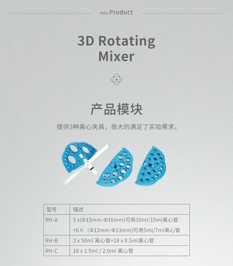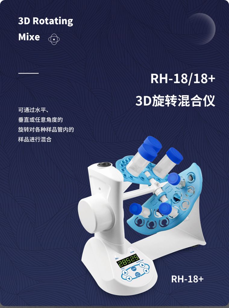 RH-18 3D旋转混合仪是一款设计独特的仪器,可通过水平、垂直或任意角度的旋转对各种样品管内的样品进行混合。通过对旋转面板的调整,可以使产品水平或垂直或介于两者之间的角度旋转,广泛应用于分子杂交、血液等需要混合的样品,旋转速度温和,位于旋转面板上的两个夹具可单独调正,这样就可以在一次混合中有两种不同的方式。 仪器精小、方便,可以很容易地转移到其它地方,实验台、冷库或者培养箱中均可使用,仪器的外壳和面板都采用了专门的设计,方便清洁及除污。