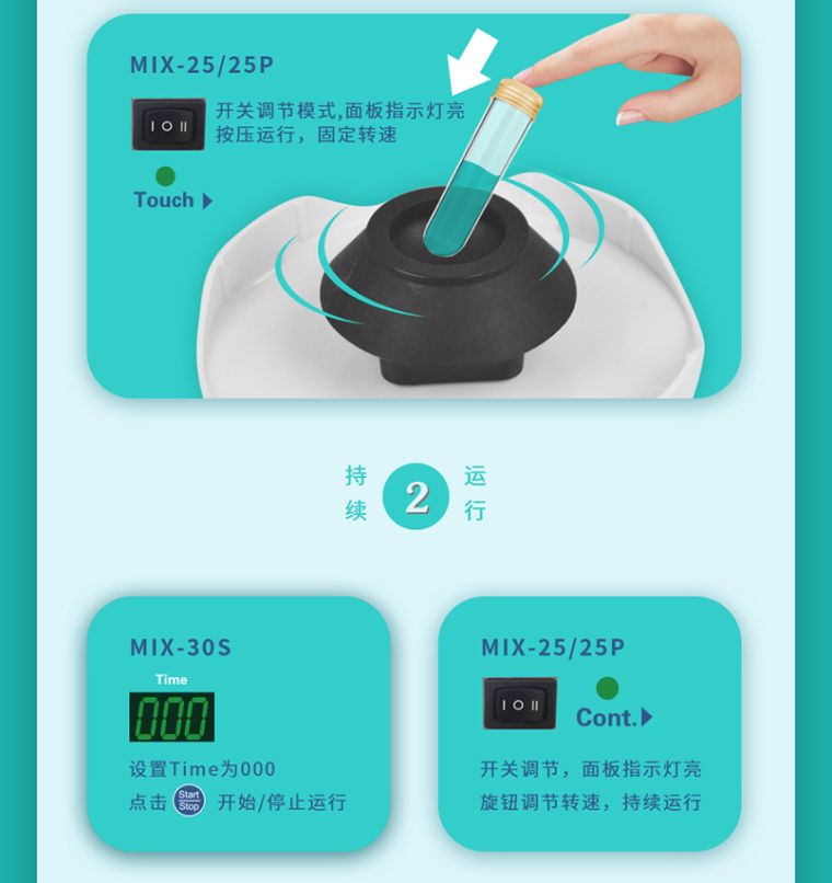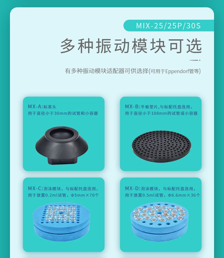 MIX-25 迷你混匀仪应用于生命科学和理化分析领域,用于样品组织、细胞、菌液、化学试剂等的振荡、混匀和搅拌工作。多种适配器可适用0.2~50ml微量管和直径小于108mm的试管或小容器。