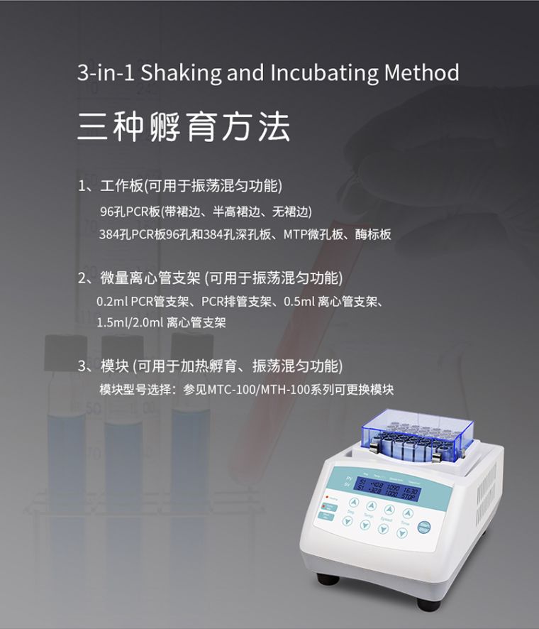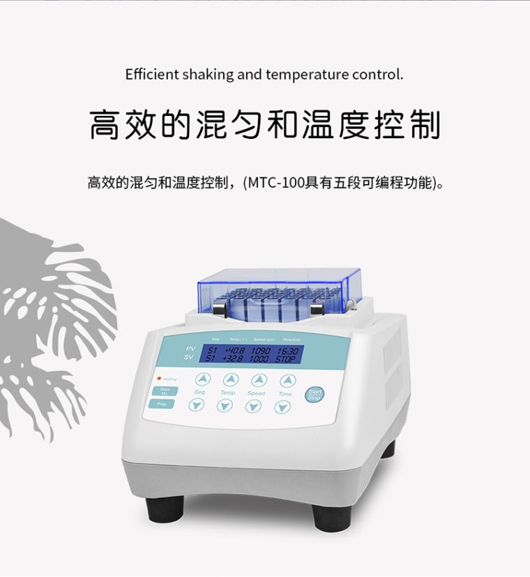 MTH-100 恒温混匀仪是混匀速度最快的一款恒温混匀产品。MTC-100整合混匀、振荡、孵育加热、制冷四种(MTH-100整合混匀、振荡、孵育加热三种)功能,融入智能操作的设计理念,它不但能混匀各种微量管、PCR板、深孔板和微孔板等实验室常用耗材,还具备对各种模块进行加热孵育、催化的功能。满足不同用户的需求。