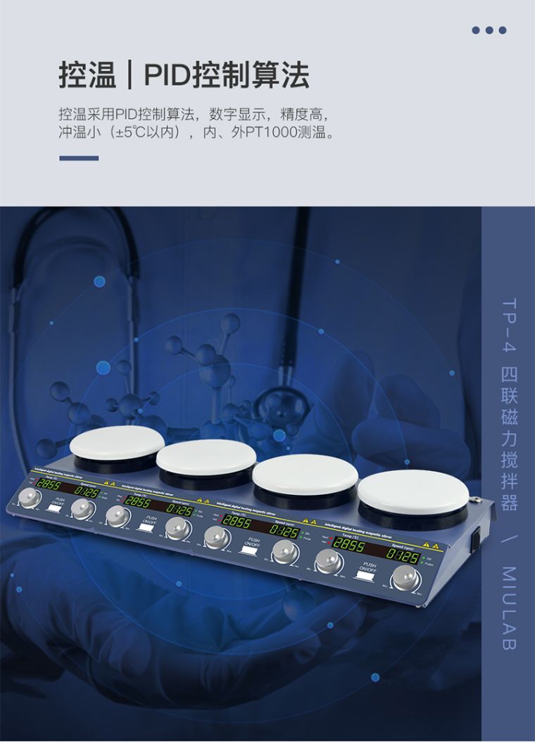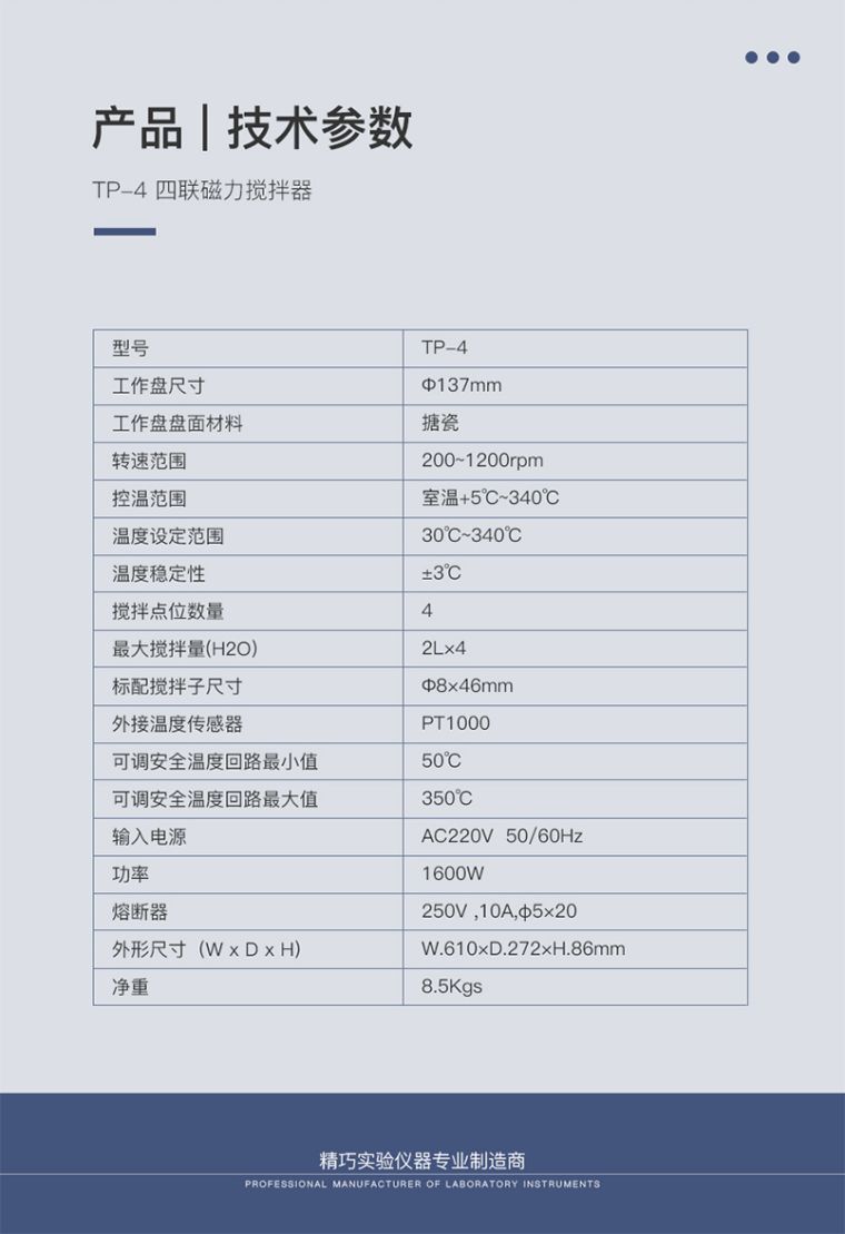 TP-4 四联磁力加热搅拌器采用特制搪瓷盘加热技术,表面最高温度可达到340℃。磁力搅拌子搅拌技术,人性化操作设计,可满足多种加热搅拌实验需求。