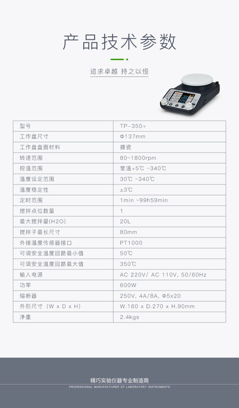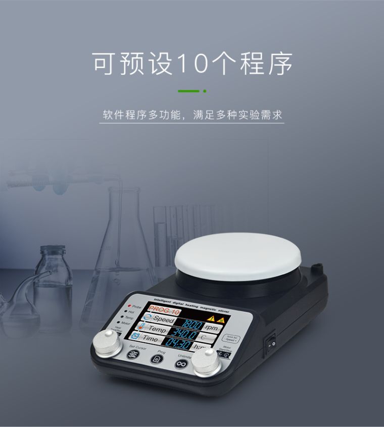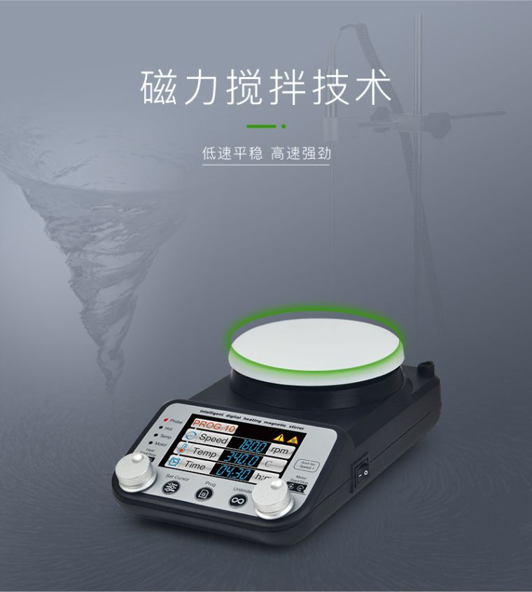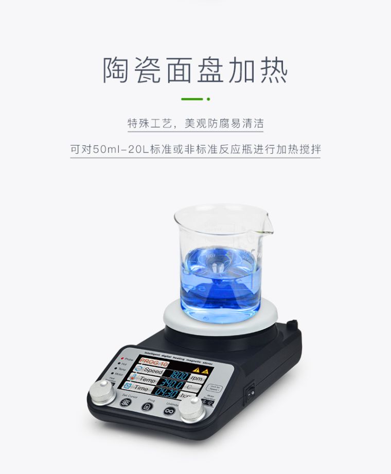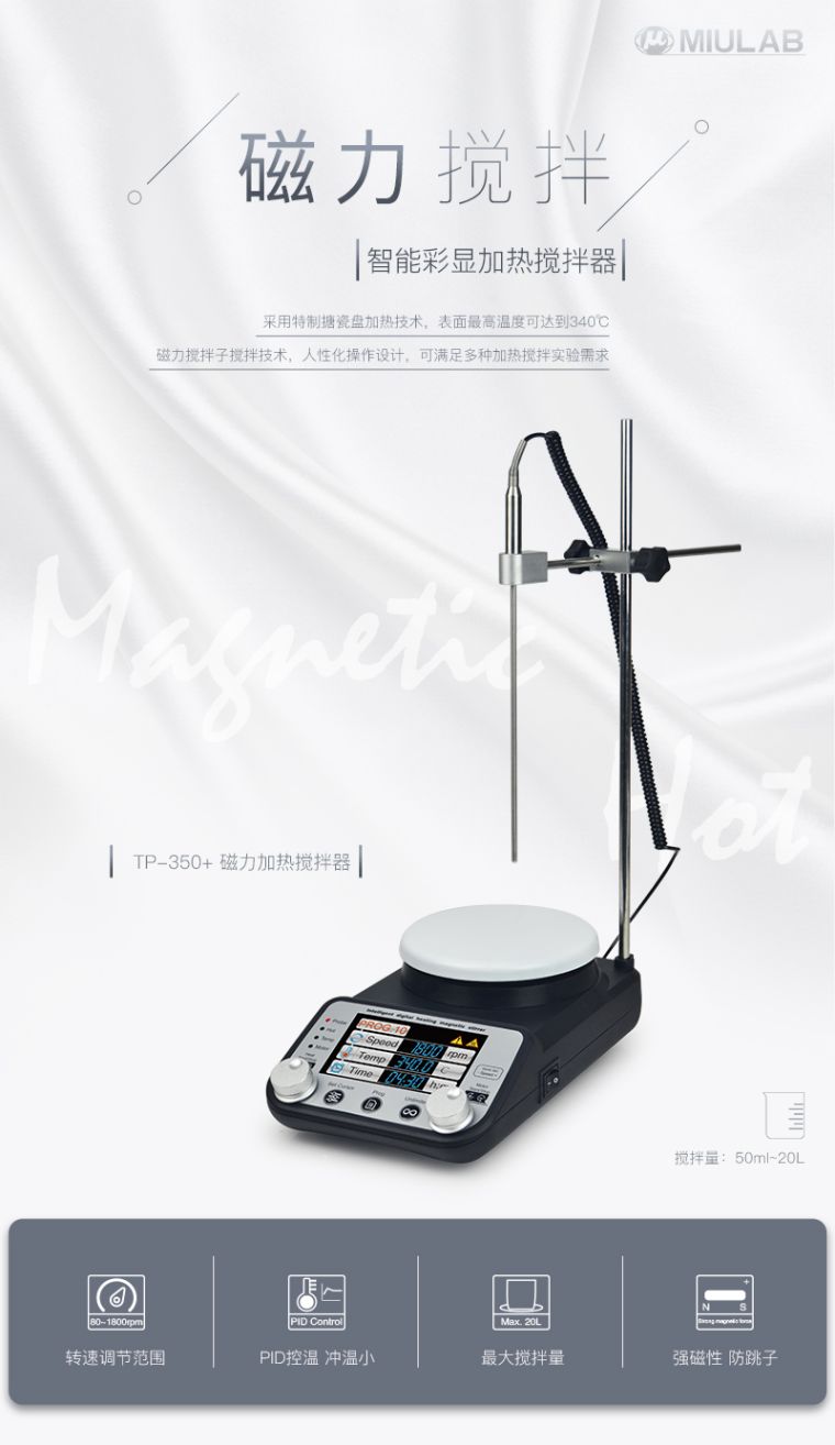 TP-350+ 磁力智能彩显加热搅拌器采用特制陶瓷盘加热技术,表面最高温度可达到340℃。磁力搅拌子搅拌技术,人性化操作设计,可满足多种加热搅拌实验需求。