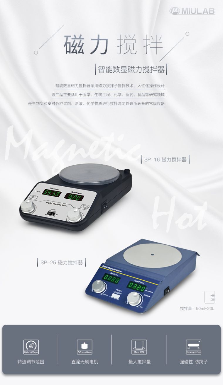 SP-25 智能数显磁力搅拌器采用磁力搅拌子搅拌技术,人性化操作设计,可满足多种加热搅拌实验需求。