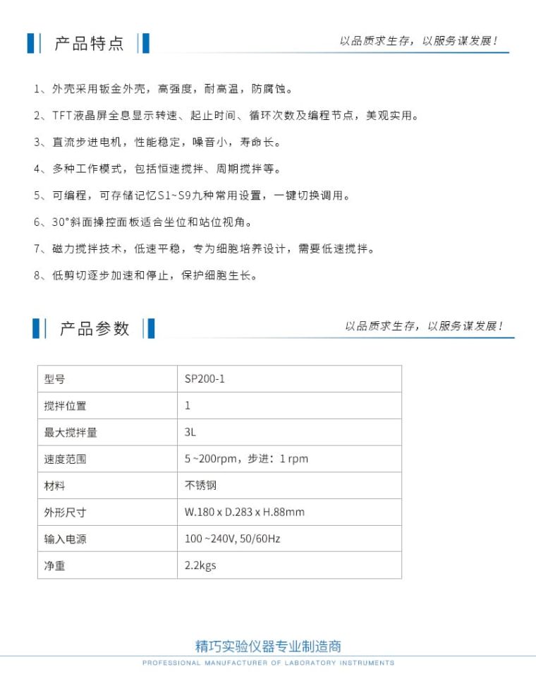 SP200-1细胞培养用低速磁力搅拌器是为科研院校、实验室和工厂等应用环境设计的,用于细胞培养及搅拌的一款专用仪器。