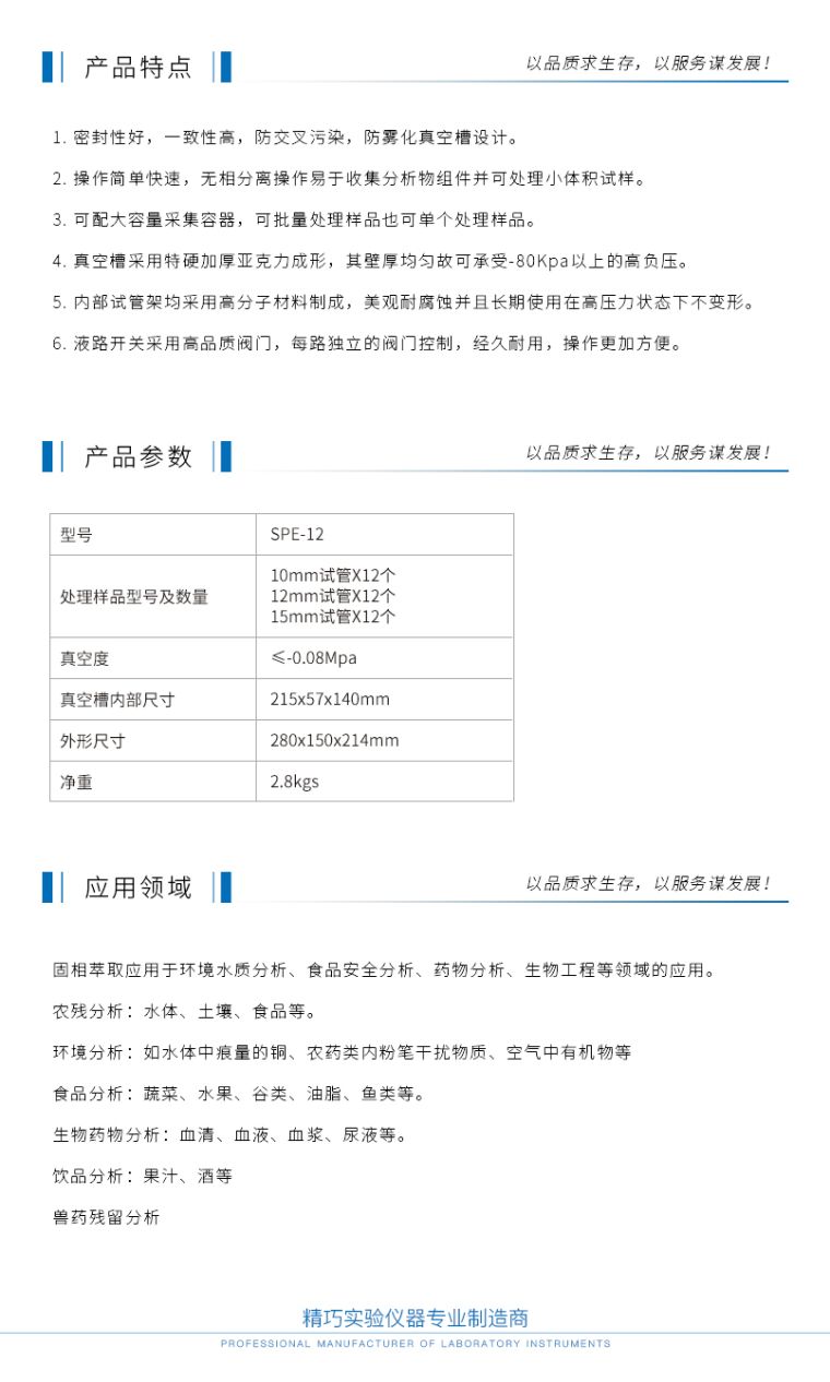 SPE-12固相萃取仪是一款被广泛应用且备受欢迎的样品前处理仪器,仪器利用固体吸附剂将液体样品中的目标化合物吸附,与样品的基体和干扰化合物分离,然后再用洗脱液洗脱或加热解吸附,达到分离和富集目标化合物的目的。固相萃取仪广泛应用于环境水质分析、食品安全分析、药物分析、生物工程等领域的应用。