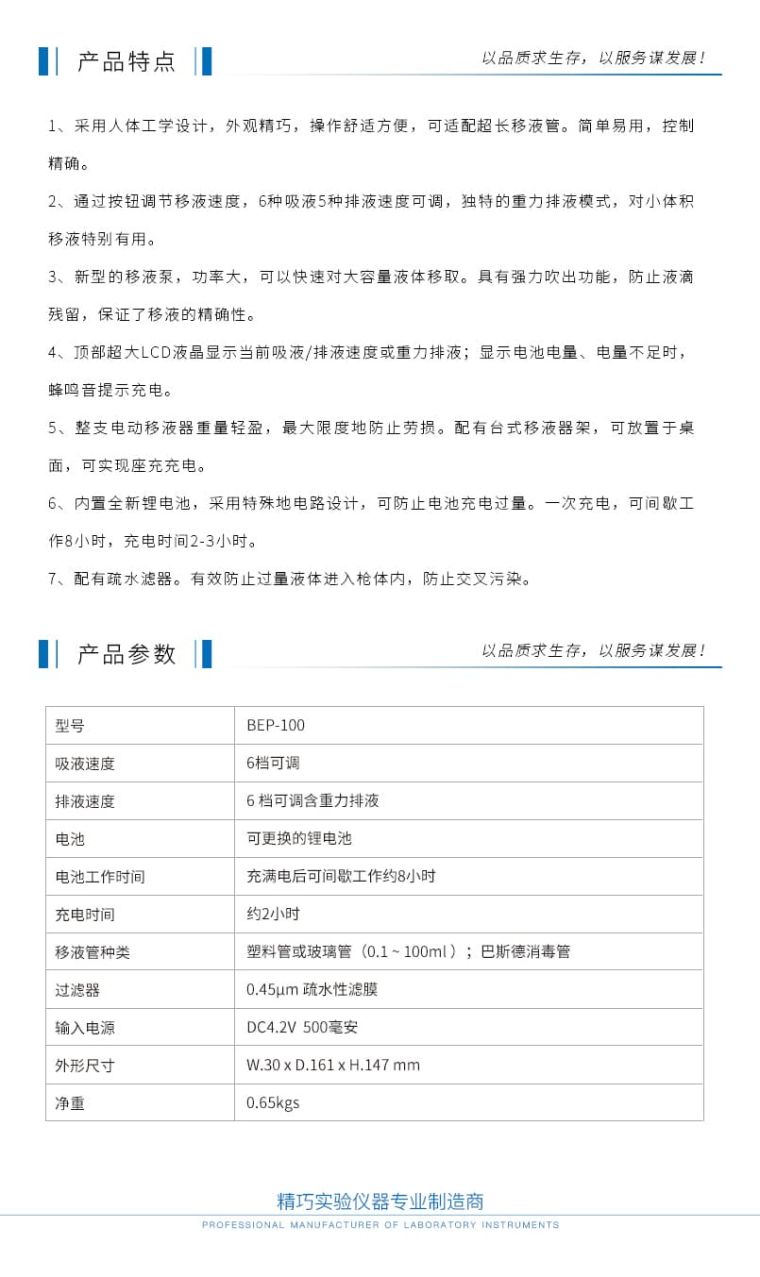 BEP-100 手持大容量移液器适用于从0.1ml到100ml的移液实验操作,仅用两个按钮就控制了从吸液到移液的全过程,移液速度可轻松调节。吸液移液快速精准、超强液晶显示、独特的人体工学设计、重量轻、强电力,持久耐用、配套齐全,是您实验室爱不释手的得力助手。